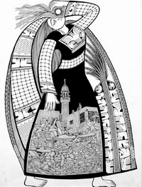 The show's artwork conveys a message of resilience and resistance. The images, sculptures and installations depict sorrow, struggle and steadfastness. In the case of the pieces by Zuhdi Al Adawi and Muhammad Rakouie, the artists had to overcome the adversity of being incarcerated as political prisoners to create their works with the limited materials available to them. John Halaka's masterful "Stripped of Their Identity and Driven From Their Land" mural, made with acrylic and the rubber-stamped ink words "Forgotten Survivors," depicts the expulsion of Palestinians from their homeland, sentenced to life as refugees. Abdel Rahmen Al Muzayen's "Jenin, 2002" series mourns the brutal assault on the Jenin refugee camp, but at the same time proudly demonstrates the strength and courage of the Palestinian people, and defiantly perpetuates the culture of Palestine with images of Palestinian dress, the kuffiyeh, and the key held by so many refugees determined to return Home. The show's curator, James Harithas, accompanied by activist and "Made in Palestine" artist Samia Halaby, visited Palestine and elsewhere in the Arab world to meet Palestinian artists and select the works for the "Made in Palestine" show. The exhibit also features works by Palestinian artists living in Germany and the United States. The exhibit debuted at the Station Museum in Houston, Texas in May 2003. Originally planned as a 3-month exhibit, the show was met with such immense success and popularity, attracting thousands of visitors, that Harithas decided to extend it for nearly three more months. Harithas then hoped to travel with the art, displaying it in museums across the country, but since then he has had difficulty finding museums willing to host the show. Off the record, Harithas has been told by other curators that they fear their museums would lose funding if they were to host an exhibit of Palestinian art. It comes as little to no surprise to Palestinians and Palestine solidarity activists that an art show "made in Palestine" would be met with hostility by Zionists. The show does in fact challenge the attempt by Zionists to erase Palestinians from existence. Opposition to the show has at its core a racist basis. The show is deemed offensive by some, because it is Palestinian. But many are committed to challenging this racism to refusing to allow Palestinian artists to be silenced. The "Made in Palestine" show recently returned to public display in April 2005 at SomArts in San Francisco, California. The exhibit will travel to Vermont in October 2005. Artists and activists in San Diego have begun fundraising efforts to bring the show back to California, and the government of Mexico City is in talks with Harithas for a showing there.