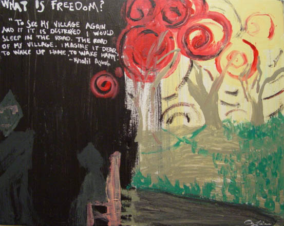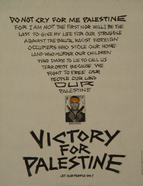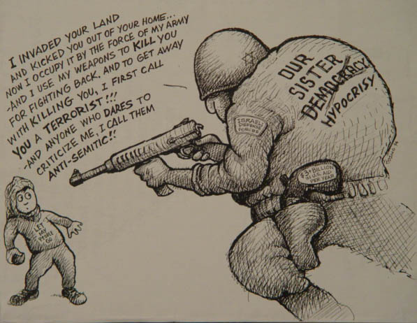 Farsad Labbauf Farsad Labbauf was born in Iran. He graduated from Rhode Island School of Design. Labbauf has participated in more than 40 group shows nationwide including showings at The Museum of Modern Art (MOMA) New York, the Downey (CA) Museum of Art, and the Dallas Museum of Science and Technology. He has also had two one person exhibitions of his work at Kingston Gallery in Boston (MA.) Among the list of publications where his work has appeared are The Philadelphia Daily News, Artspeak, and The Wall Street Journal. His pieces are in the hands of numerous distinguished collectors including the Walt Disney Company. Labbauf will be showing at the Jersey City (NJ) Museum in the fall and currently lives and works in the New York. Amanda Levin Amanda Levin is an organizer for Solidarity for Palestinian Human Rights in Montreal, a student in Urban Studies, and Socioeconomic Development at McGill University , an organizer for CEPAL, The Coalition Against the Deportation of Palestinian Refugees, and Al-Huda. She currently lives and works in Montreal. She is also a makeshift poet and artist. Tracey Luszcz Tracey Luszcz is a teacher, poet, community activist and photographer whose work on Cuba, protests against police brutality and the anti-war movement was exhibited in "Documenting the Peace Move/meant" earlier this year in Jersey City. Conor McGrady Conor McGrady was born in Downpatrick, Northern Ireland in 1970. He studied at Cumbria College of Art and Design in Carlisle, UK and at the University of Northumbria, Newcastle, UK, before receiving his MFA at The School of the Art Institute of Chicago in 1998. In 2002 he was selected to participate in the Whitney Biennial at the Whitney Museum of American Art, New York. In 2003 he completed a five-month residency in the Woolworth Building, New York, through the Lower Manhattan Cultural Councils Studio Program. He currently lives and works in New York. Nabeel Muaddi is a Palestinian artist living in Pennsylvania. His paintings focus primarily on political and religious statements about situations in the Middle East and how western outsiders have affected them. Kevin Noble Kevin Noble was an active member of Hallwalls Gallery, an artist run non-profit gallery in Buffalo NY from 1975 -1981. He has had one person shows of his work, which includes painting, video and photography, at Hallwalls, Cepa Gallery, Artists' Space, The Kitchen, White Columns, and File an Phoblacht, Belfast, Ireland. He has also shown in group shows at the Albright-Knox Art Gallery, The New Museum, The Alternative Museum, the Cannon Congressional Office Building in Washington, D.C., Grand Central Station in New York and the Galway Arts Center in Galway, Ireland. He is a founder and is currently active with Culture & Conflict Group. Eric Ringsby is a multi-media artist and author living in Colorado. His Anti-Occupation Art parallels the histories of Native Indians and Palestinian people. Eric has taught at the Chicago Art Institute, University of Wyoming and won the Mexican National Prize for Installation Art in 1997. Melina Rodrigo Melina Rodrigo is a New York City - based graphic artist who uses illustration and design to address various social and political issues. Rouzbeh is a graphic artist and designer, and creative and art director of RB Studios. Mary Tuma Textile artist Mary Tuma received her MFA in Fibers from the University of Arizona Tucson, and currently holds the rank of Assistant Professor at the University of North Carolina at Charlotte. She has participated in numerous solo and group exhibitions. Tuma's materials and techniques are driven by the development of concept and context. Lisa Volta Lisa Volta is an artist and activist living and working in Philadelphia. She completed her undergraduate work and received her BFA from Tyler School of Art. Volta is a member of Artists Against the Occupation and has spoken at Temple University and the University of Pennsylvania on using fine arts as a means to expose social and political injustice and genocide, specifically concerning the issue of Palestine. She is currently curating her third exhibition about Palestine, which is scheduled to open in September of 2004 at the AFSC Friends Center in Pasadena, California. Mizuko Yakuwa is the founder of the Artists Against the Occupation, an international collective of artists inspired by the successful mid-1980s project, "Arts Against Apartheid." She was born in Sendai, Japan in 1947. She has held numerous solo exhibitions in Japan. She has exhibited in group shows at various galleries & museums around the world. Palestinian children The children of refugee camps in Palestine and Lebanon reveal the realities of life under occupation and oppression in these beautiful drawings. Donated from the collection of Samia Halaby. |