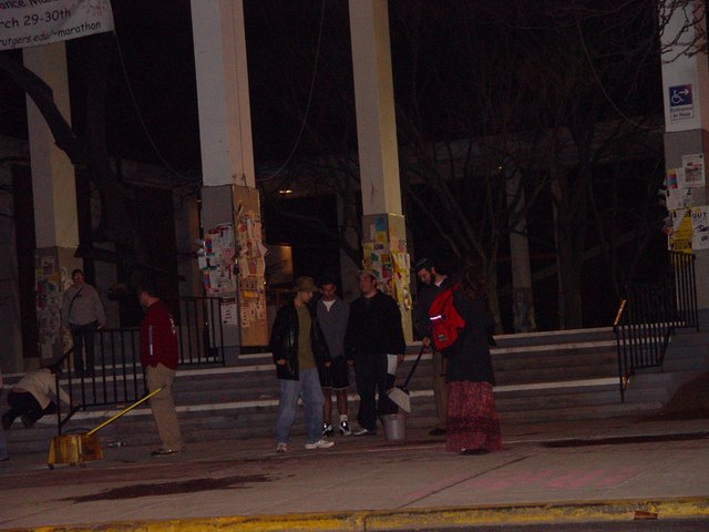 Local opponents of the Palestinian struggle for justice bring out mops and scrub brushes to remove messages such as "Rembember Rachel Corrie" and "Free Palestine".
